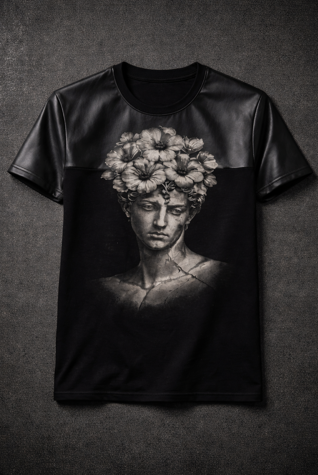 A study in material contrast and art driven storytelling. Classical marble imagery meets structured leather form, transforming a familiar silhouette into a refined street luxury statement.